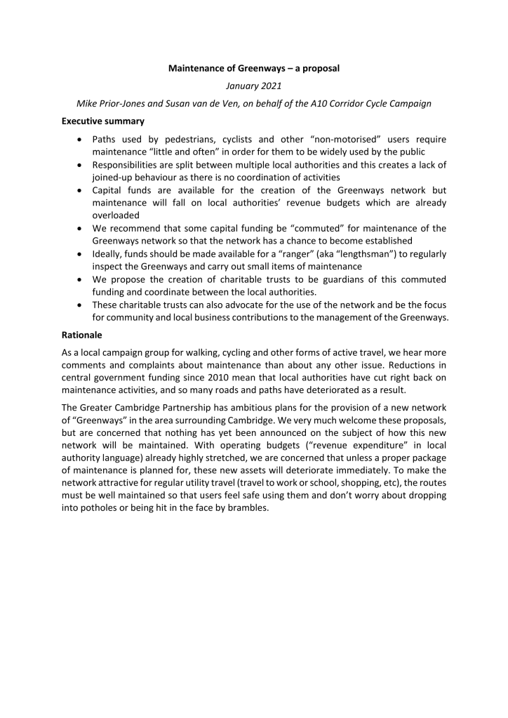 Contact: Susan van de Ven, A10 Corridor Cycling Campaign chair, 0790532557